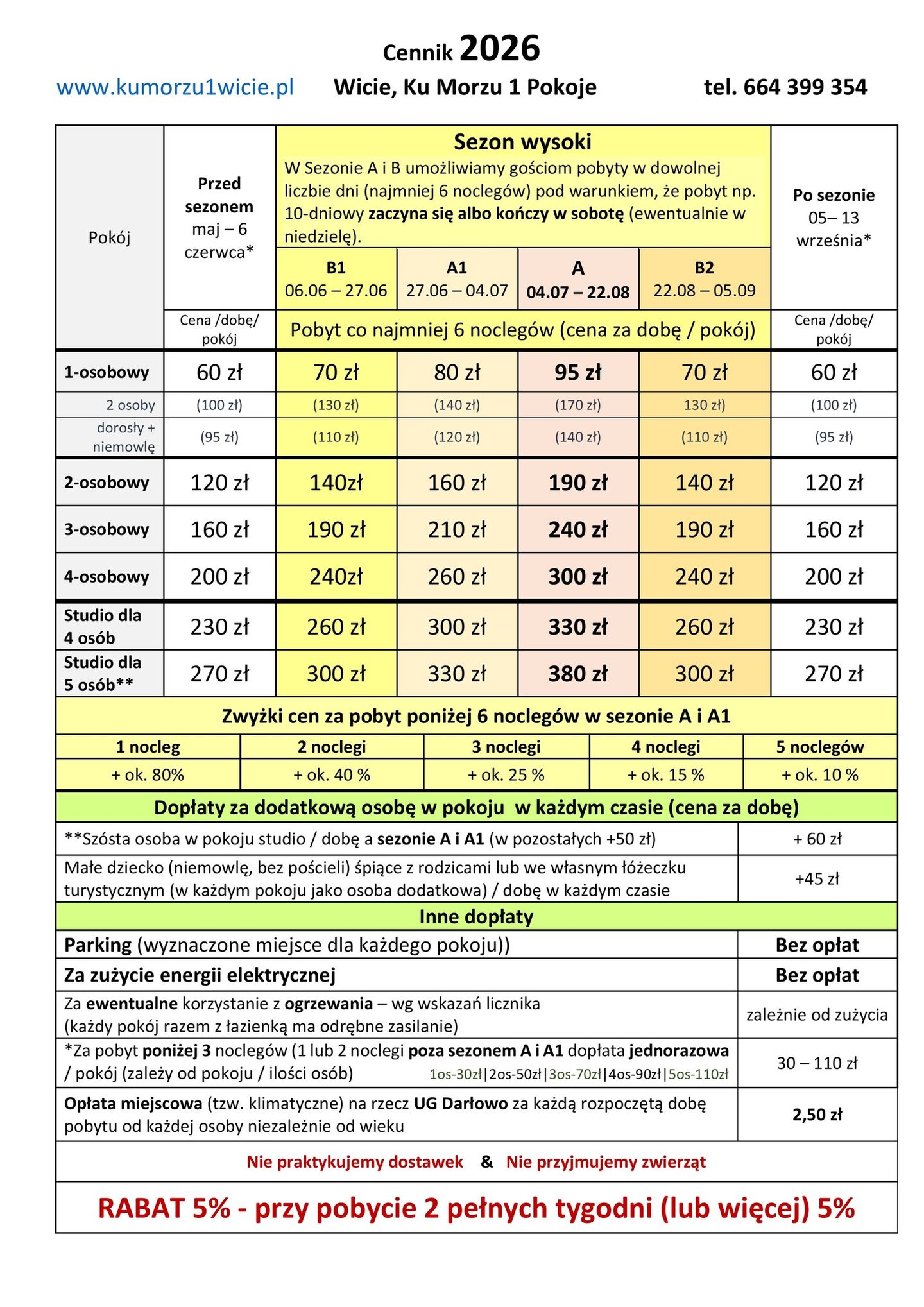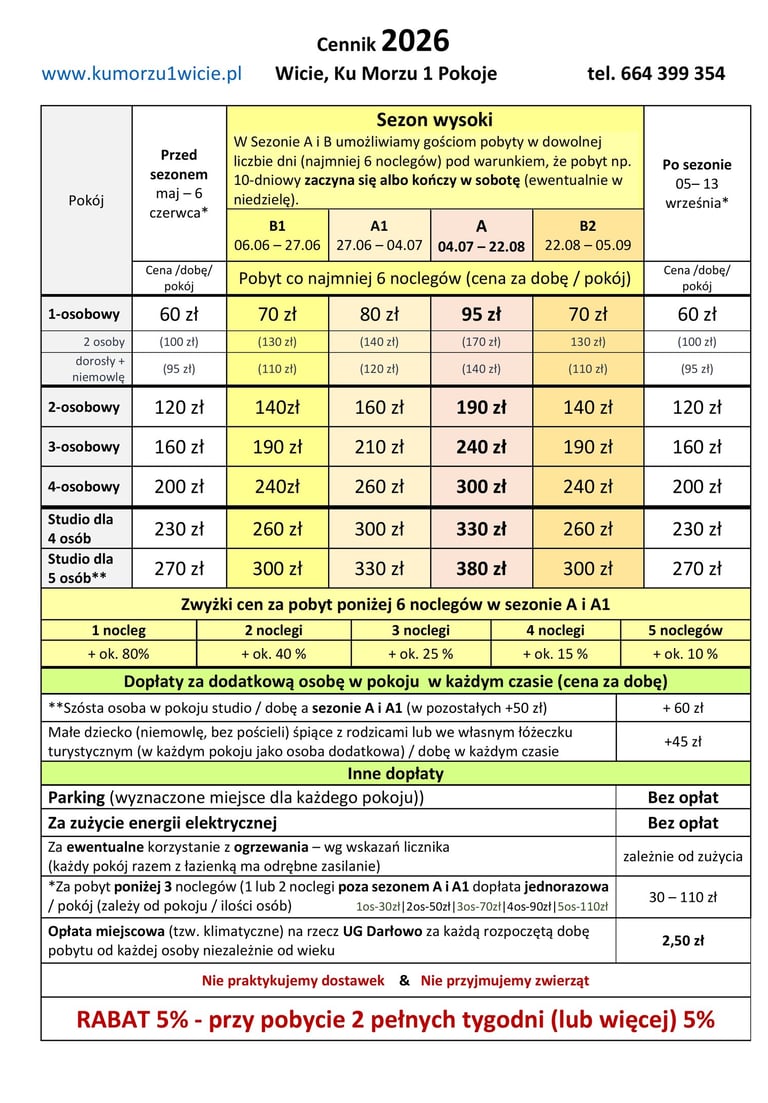 Przy pobytach krótszych niż 6 noclegów ceny są wyższe.