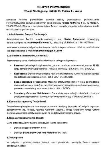 Niniejsza Polityka prywatności określa zasady gromadzenia, przetwarzania i wykorzystywania danych osobowych gości obiektu Pokoje Ku Morzu 1 (ul. Ku Morzu 1, 76-150 Wicie). Dbamy o bezpieczeństwo Twoich danych, stosując odpowiednie środki techniczne i organizacyjne.