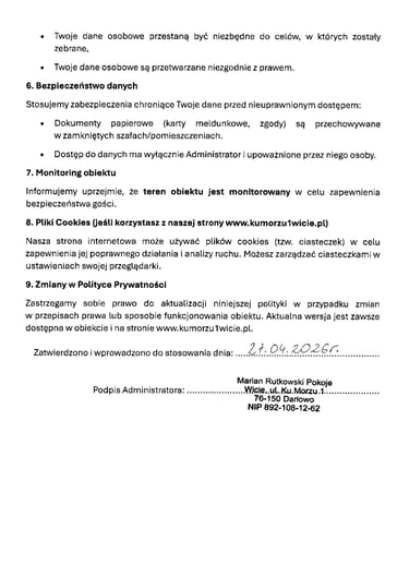 Zastrzegamy sobie prawo do aktualizacji niniejszej polityki w przypadku zmian w przepisach prawa lub sposobie funkcjonowania obiektu. Aktualna wersja jest zawsze dostępna w obiekcie i na stronie www.kumorzu1wicie.pl.